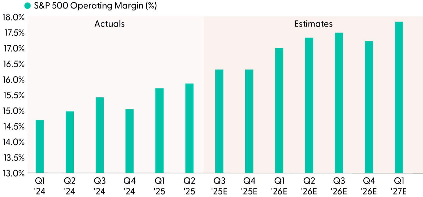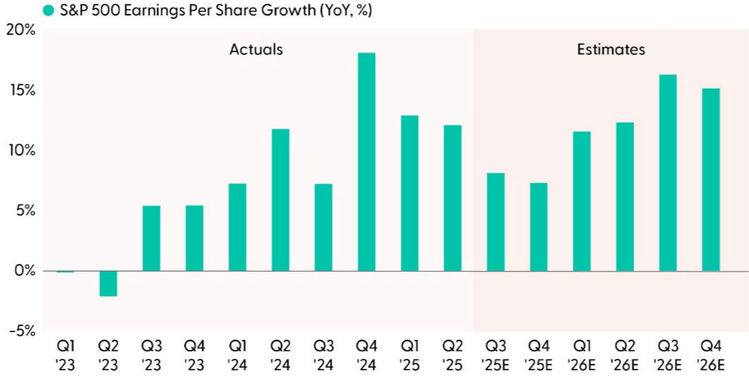 In our view, we believe corporate America should continue to deliver solid earnings growth in the third quarter with few surprises. Given the solid economic backdrop, resilient earnings estimate trends, the tailwind of AI capital investment, and a weak U.S. dollar, it's very likely earnings will deliver another 5-7% upside to current consensus estimates and grow earnings at a low-teens pace in Q3. It won't be easy, however, because companies had to absorb more tariff costs last quarter compared with Q2.