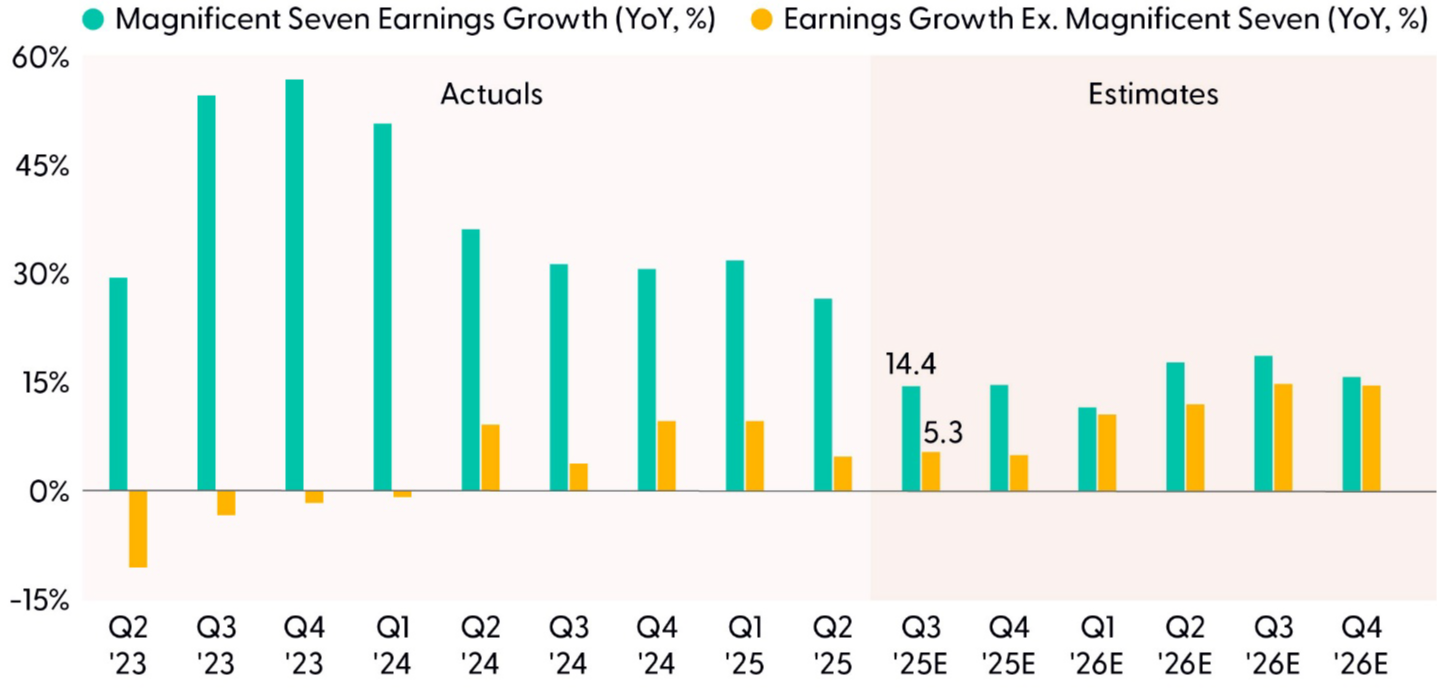 Disclosures: Indexes are unmanaged and cannot be invested in directly. Past performance is no guarantee of future results. Estimates may not materialize as predicted and are subject to change. Magnificent Seven includes Alphabet (GOOG/L), Amazon (AMZN), Apple (AAPL), Meta (META), Microsoft (MSFT), NVIDIA (NVDA), and Tesla (TSLA).